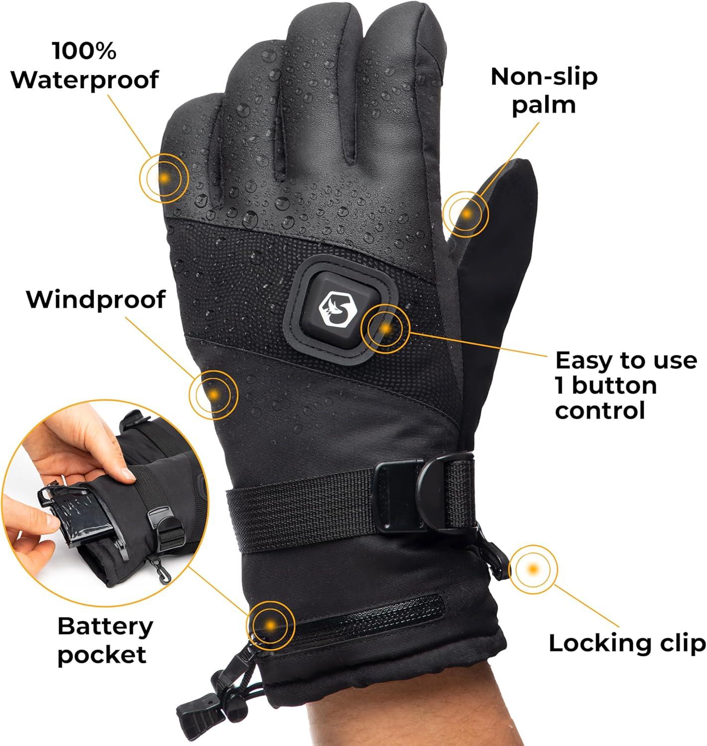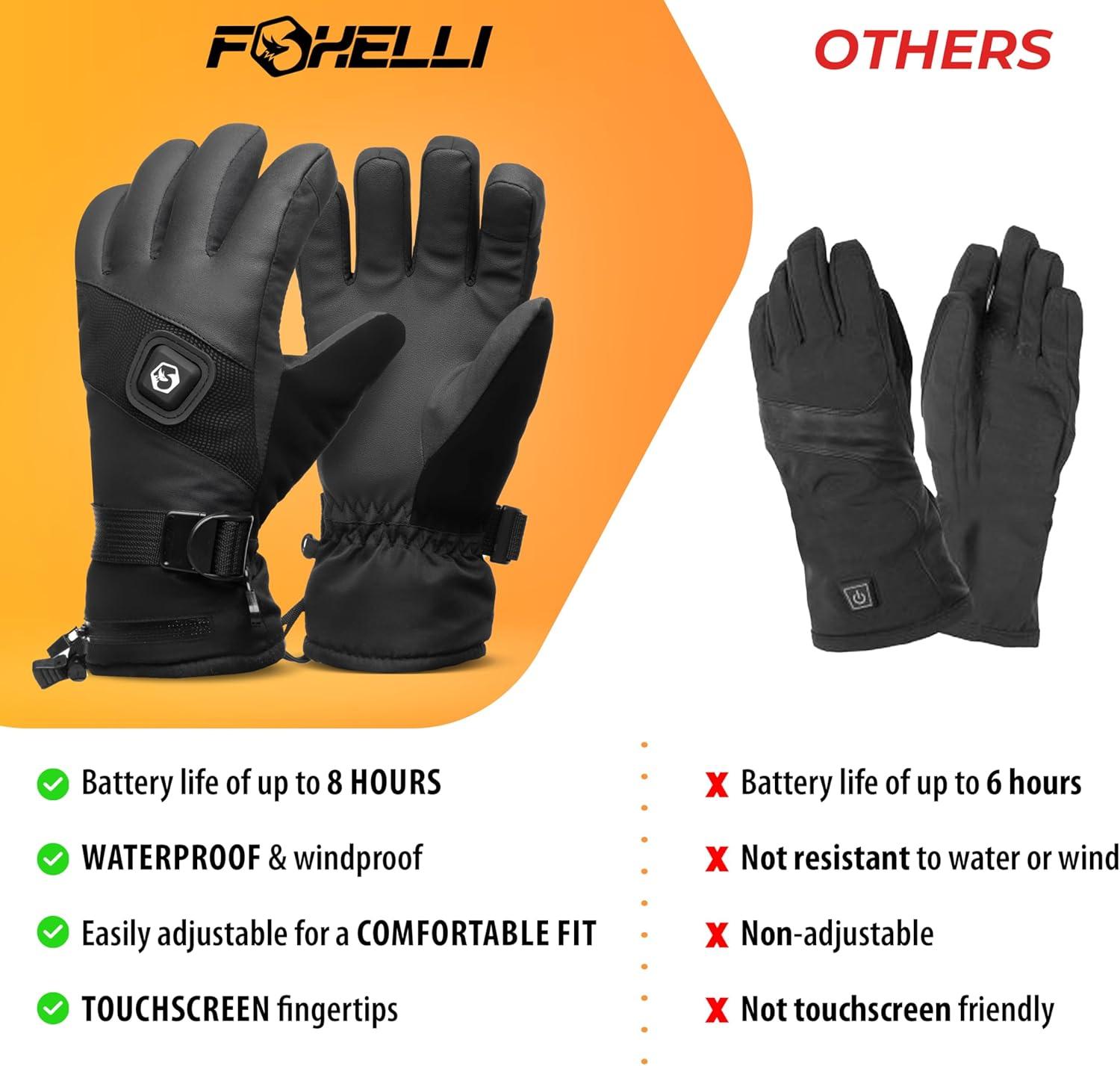 Foxelli Heated Gloves for Men & Women – 3 Heat Settings, Touchscreen Compatible, Rechargeable Waterproof Electric Gloves for Winter Outdoor Sports