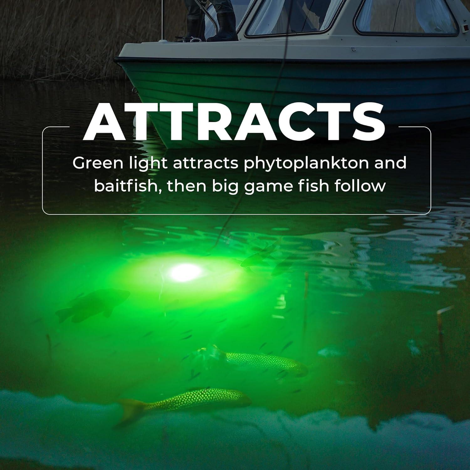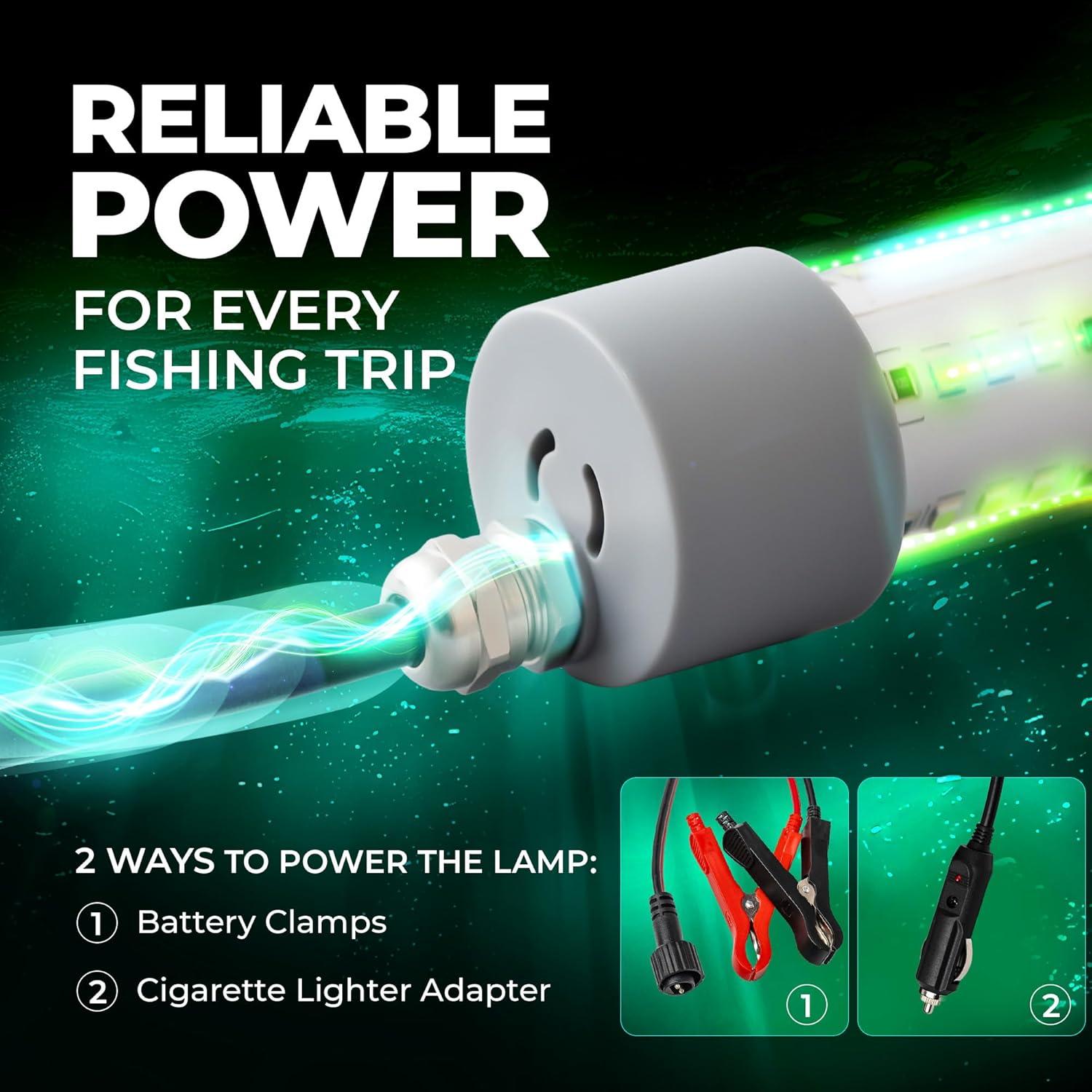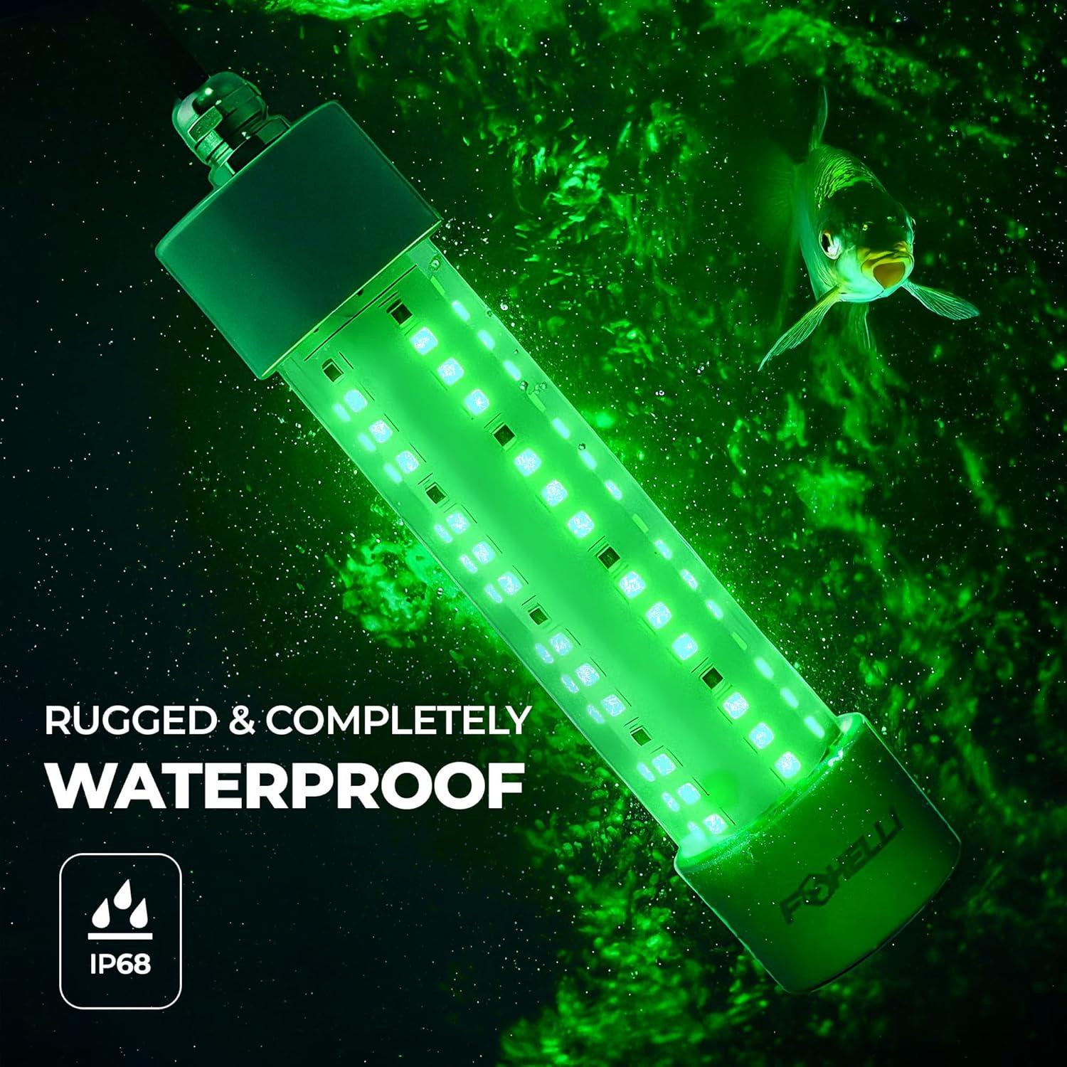 Foxelli Underwater Fishing Light – 3900-Lumen DC12V 30W Submersible IP68 Waterproof Green Fishing Light Attractant with 33ft Cable & Battery Clamps for Night Crappie & Squid
