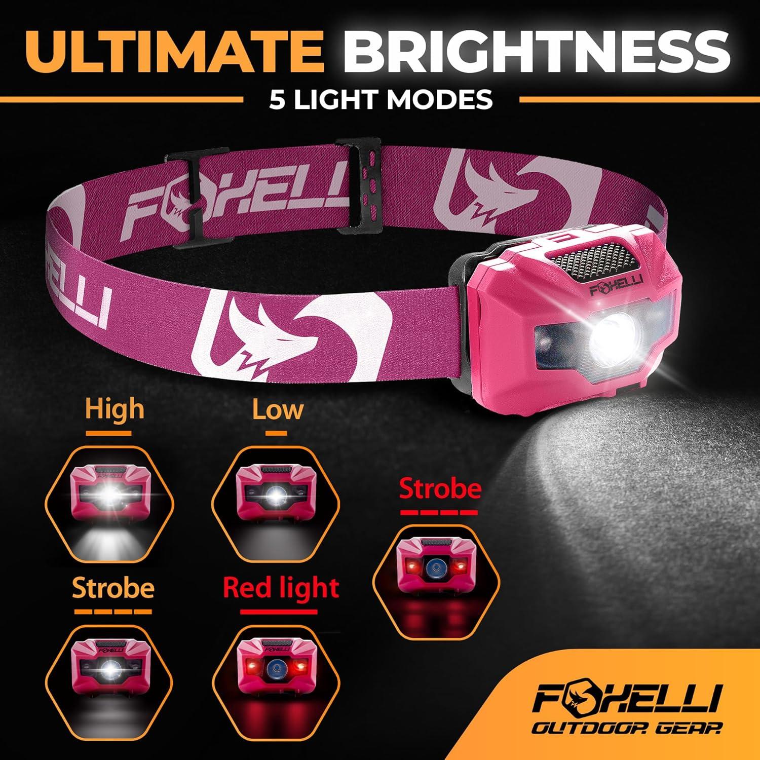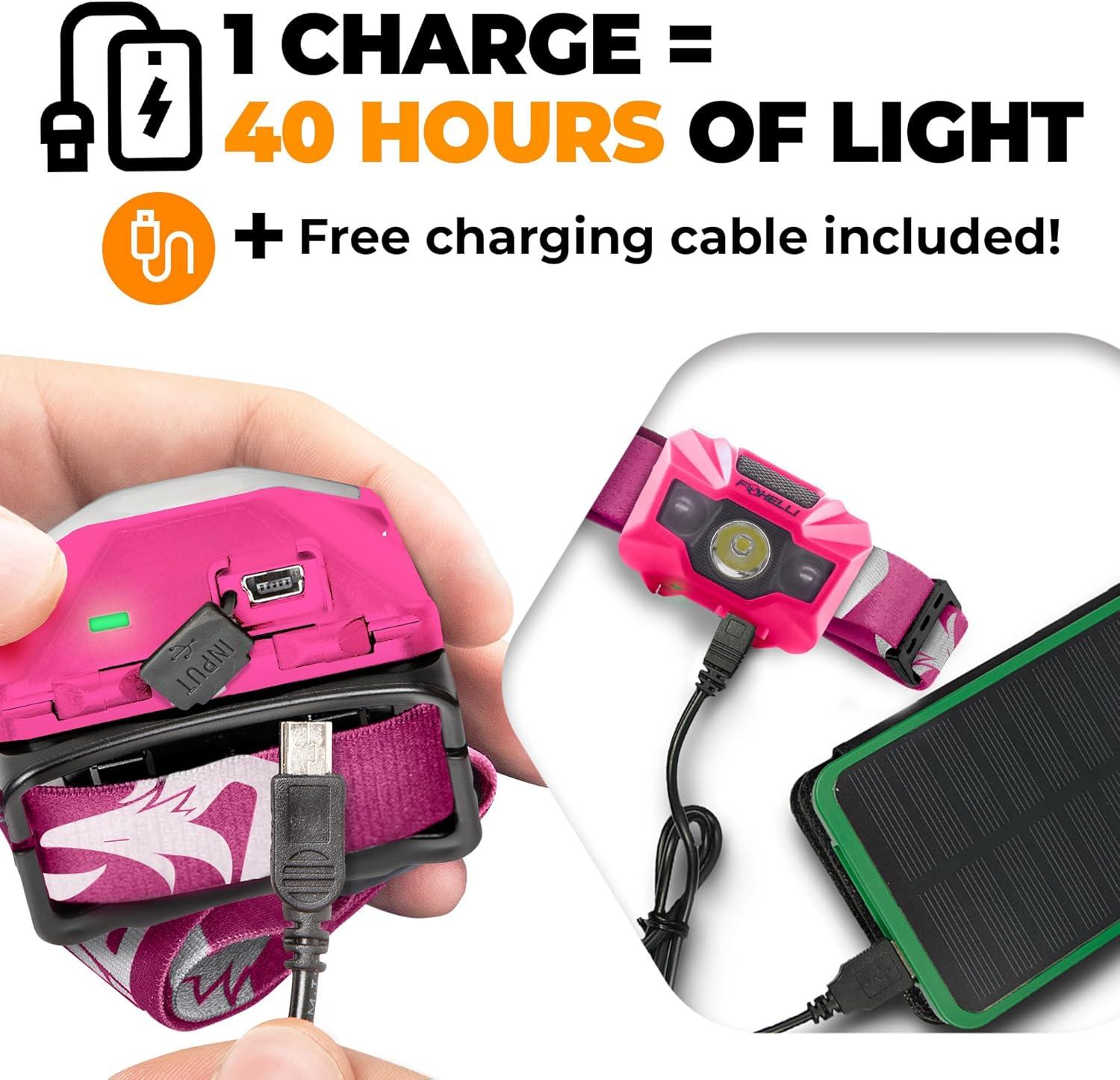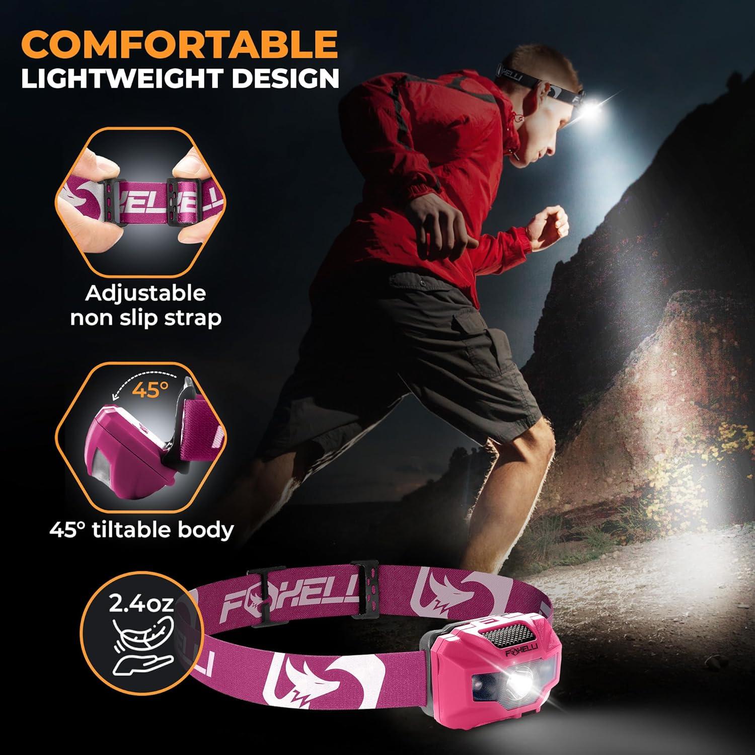 Foxelli USB‑C Rechargeable LED Headlamp – Ultra‑Light 2.4 oz & Bright 180 Lumens – Red/White Light, 5 Modes, IPX5 Waterproof, 40 h Runtime for Trail Running, Camping, Hiking(Neon Pink)