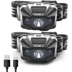 Foxelli USB‑C Rechargeable LED Headlamp – Ultra‑Light 2.4 oz & Bright 180 Lumens – Red/White Light, 5 Modes, IPX5 Waterproof, 40 h Runtime for Trail Running, Camping, Hiking(2-Pack Black)