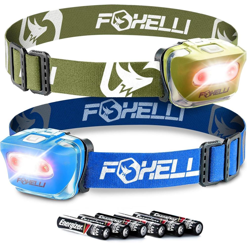 Foxelli LED Headlamp Bundle of 2 – Khaki & Blue: Waterproof, White & Red Light, Comfortable Band, 3 AAA Batteries Included
