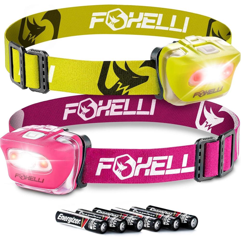 Foxelli LED Headlamp Bundle of 2 – Yellow & Pink: Waterproof, White & Red Light, Comfortable Band, 3 AAA Batteries Included