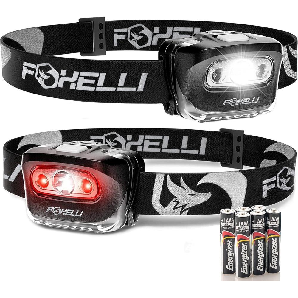 Foxelli LED Headlamp Flashlight for Adults & Kids, Running, Camping, Hiking Head Lamp with White & Red Light, Comfortable Headband, Lightweight & Waterproof, 3 AAA Batteries(2-Pack Black)