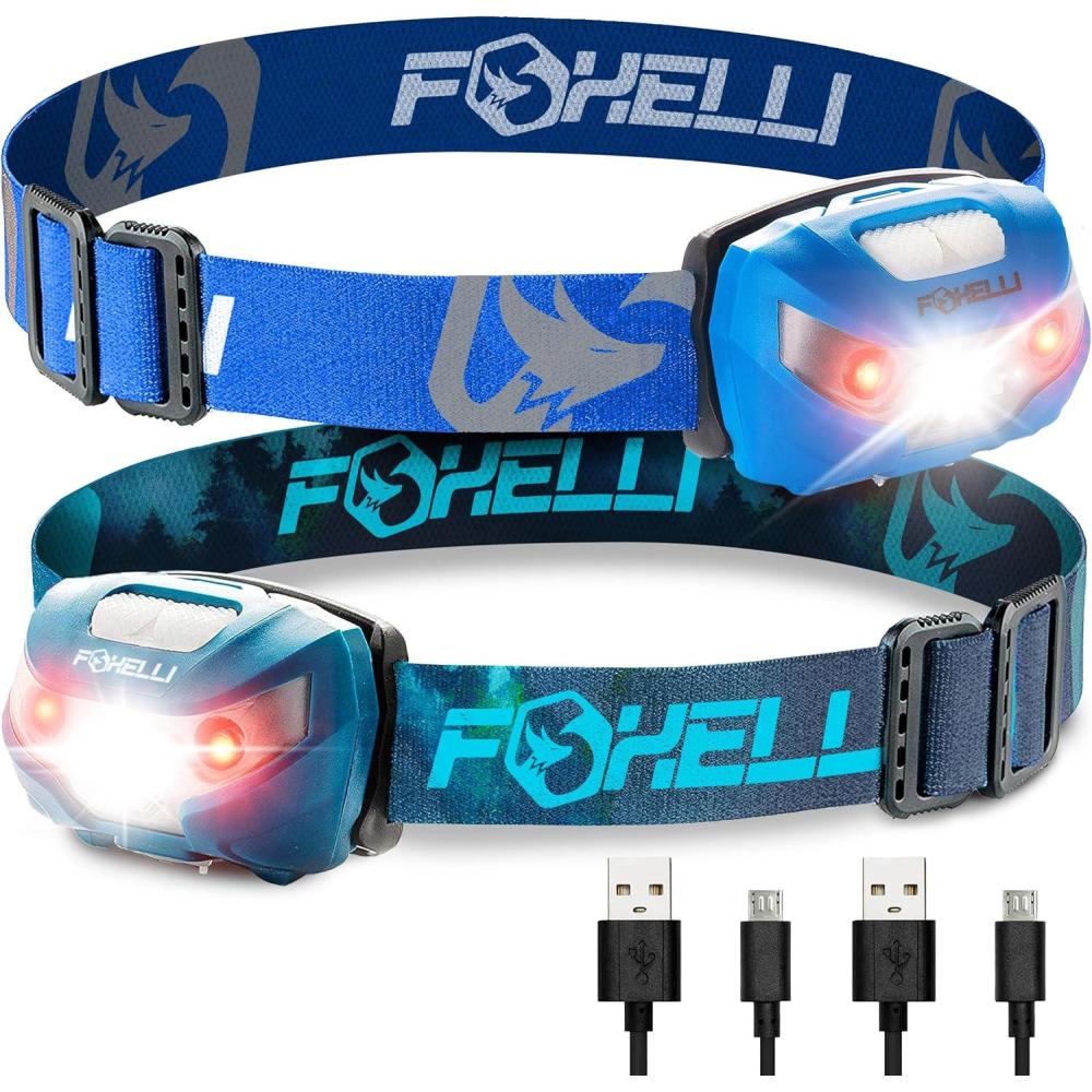Foxelli Rechargeable Headlamp Bundle of 2 – Blue & Forest: Super Bright LED Head Lamps, Lightweight & Comfortable for Running, Camping, Hiking & Work