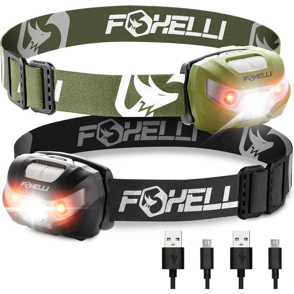 Foxelli Rechargeable Headlamp Bundle of 2 – Khaki & Black: Super Bright LED Head Lamps, Lightweight & Comfortable for Running, Camping, Hiking & Work