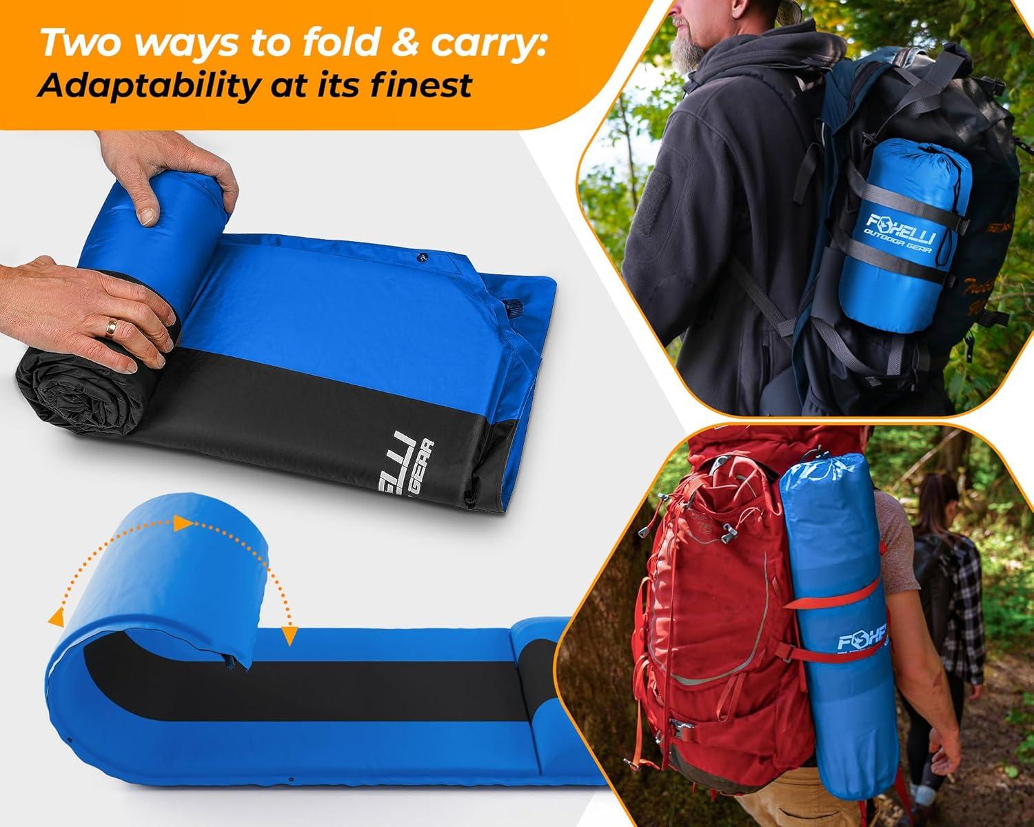 Foxelli Self Inflating Sleeping Pad for Camping, Backpacking, Hiking, Insulated Foam Lightweight Camping Mat, Inflatable Camp Mattress with Pillow(Blue-grey)