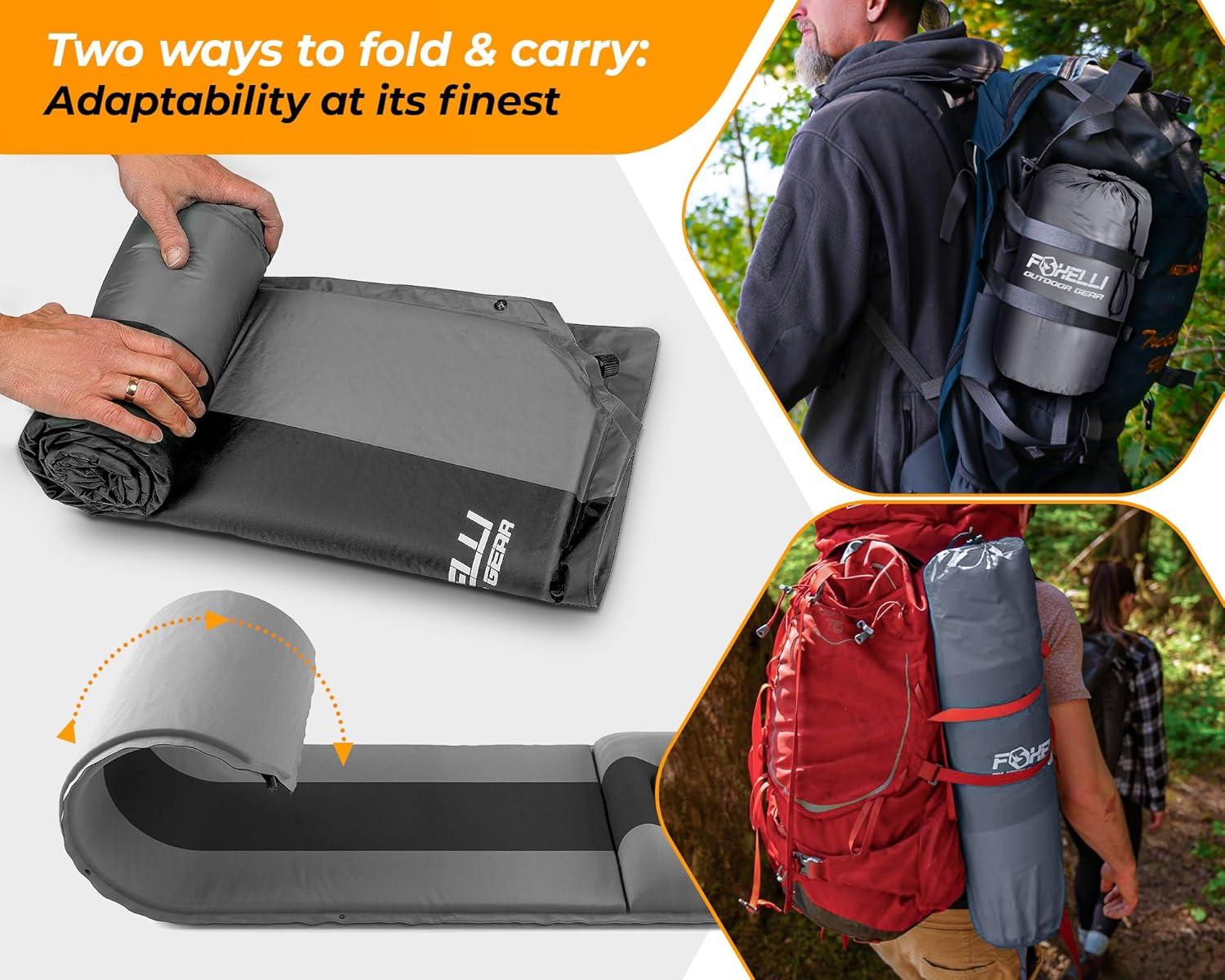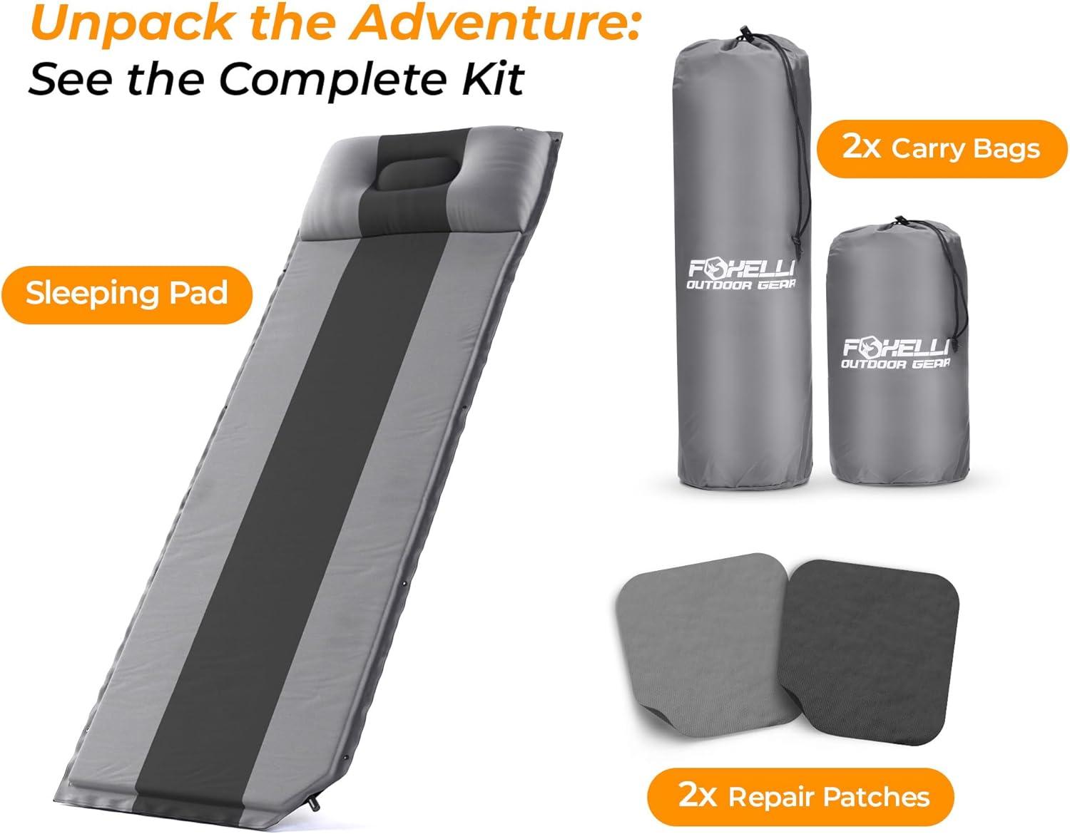 Foxelli Self Inflating Sleeping Pad for Camping, Backpacking, Hiking, Insulated Foam Lightweight Camping Mat, Inflatable Camp Mattress with Pillow(Grey-black)