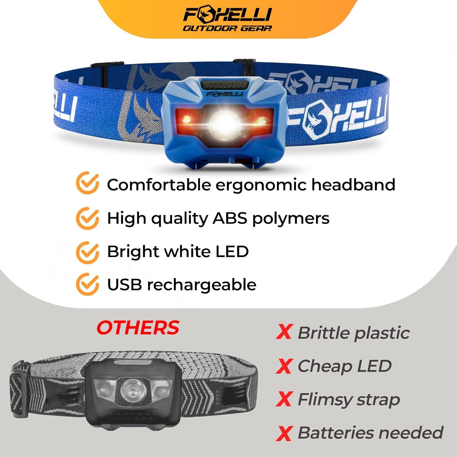 Foxelli USB‑C Rechargeable LED Headlamp – Ultra‑Light 2.4 oz & Bright 180 Lumens – Red/White Light, 5 Modes, IPX5 Waterproof, 40 h Runtime for Trail Running, Camping, Hiking(Blue)